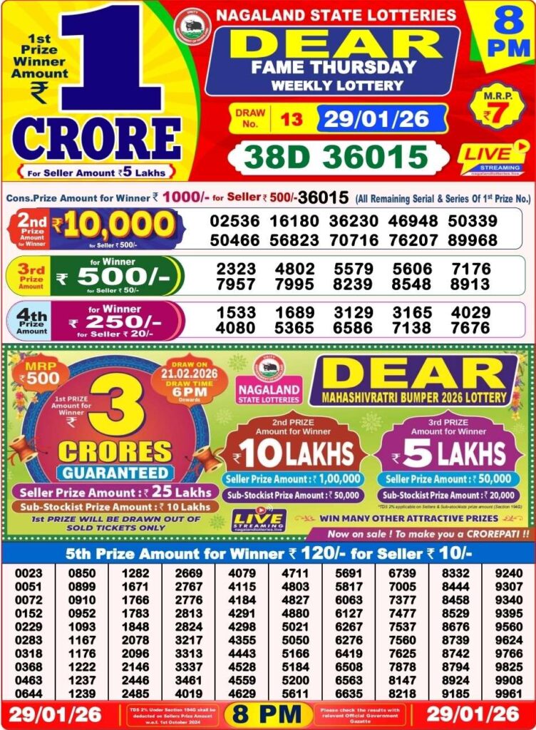 আজকের প্রথম খেলা ১১টা ৫৫ এর সময় নাগাল্যান্ড রাজ্য লটারি থেকে ‘DEAR TEESTA MORNING’, আজকের দিনের লটারি সংবাদের দ্বিতীয় খেলা নাগাল্যান্ড এর ই কোহিমা শহর থেকে বিকাল ৪টার সময় ‘DEAR MOON TUESDAY’, আজকের শেষ খেলা রাত ৮টার সময় নাগাল্যান্ডের ‘DEAR PARROT EVENING’, প্রত্যেক টি খেলার পুরস্কার ই ১ কোটি টাকা।