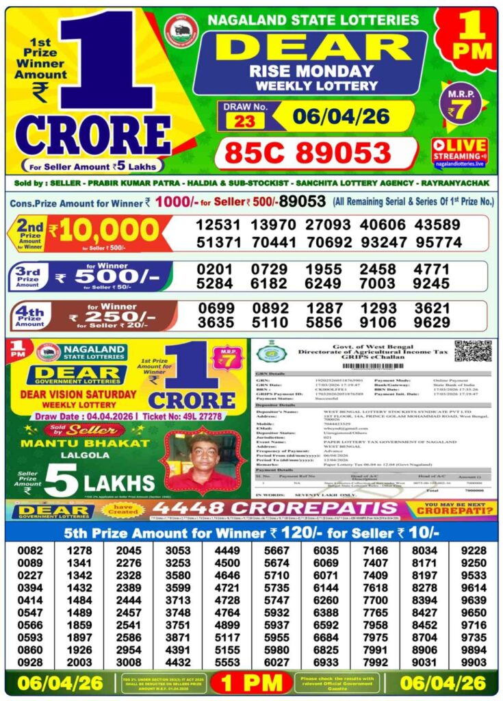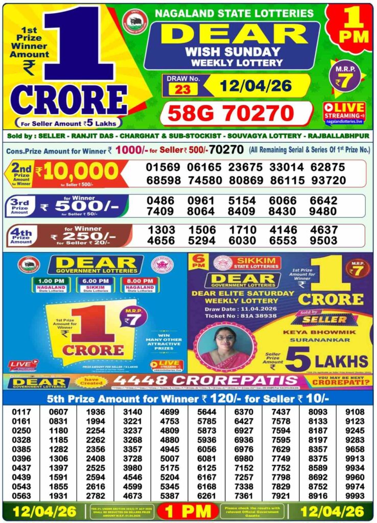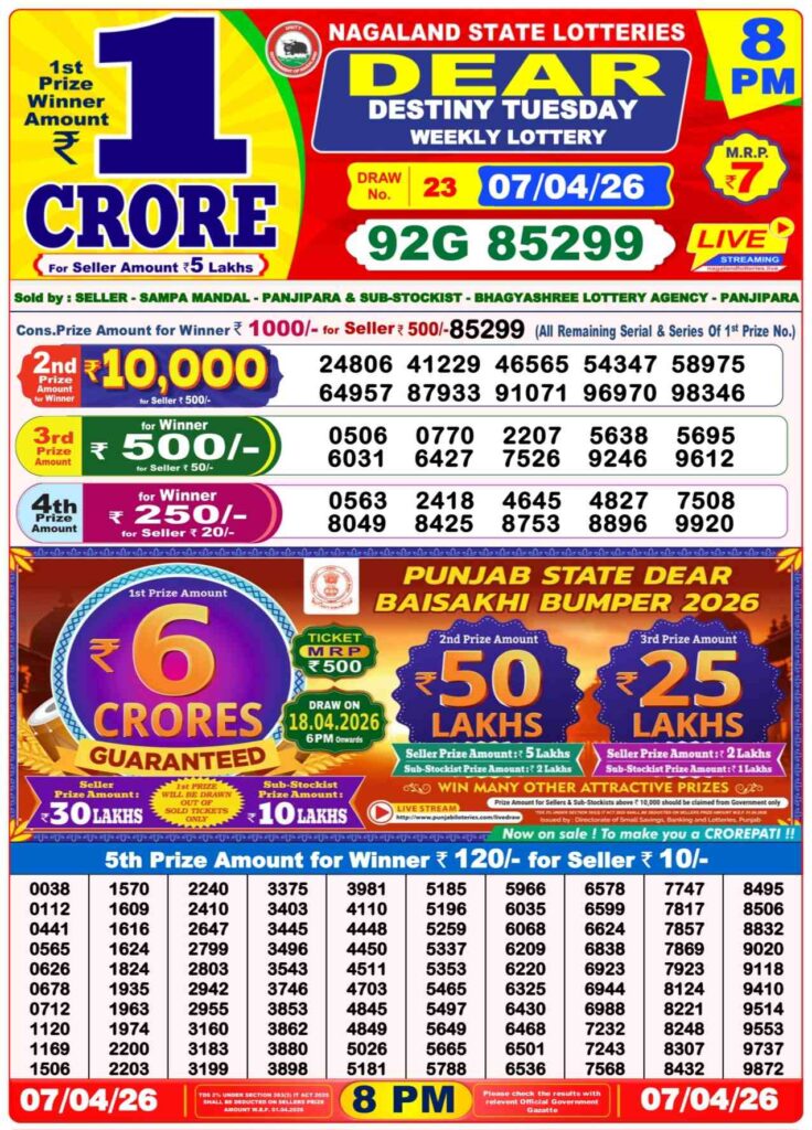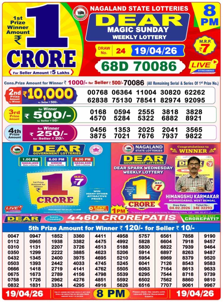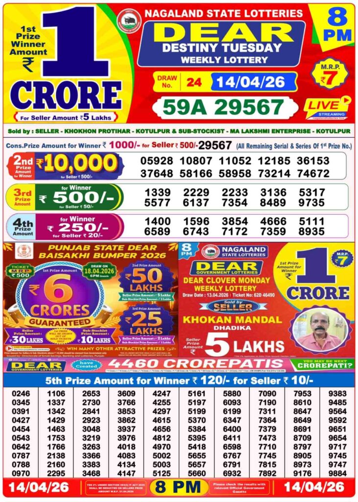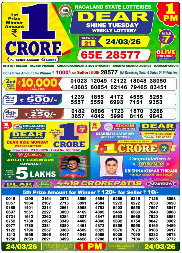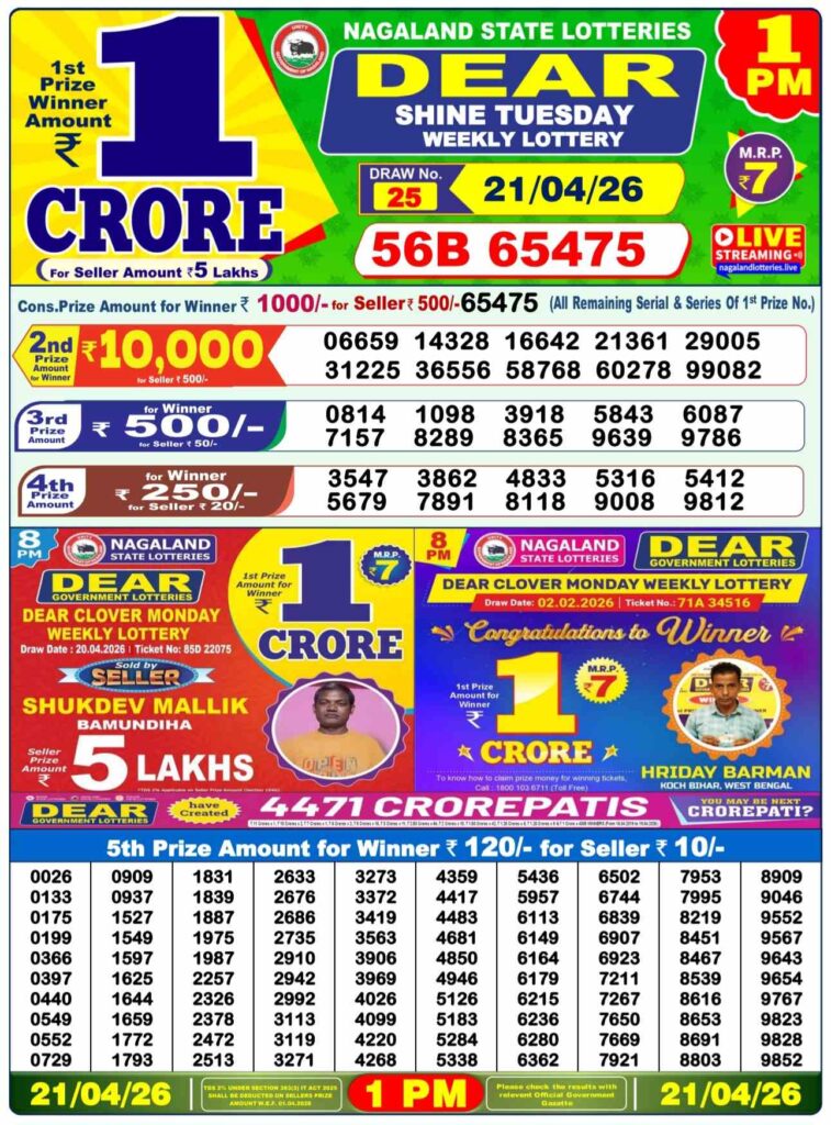 আজকের প্রথম খেলা ১১টা ৫৫ এর সময় নাগাল্যান্ড রাজ্য লটারি থেকে ‘DEAR TEESTA MORNING’, আজকের দিনের লটারি সংবাদের দ্বিতীয় খেলা নাগাল্যান্ড এর ই কোহিমা শহর থেকে বিকাল ৪টার সময় ‘DEAR MOON TUESDAY’, আজকের শেষ খেলা রাত ৮টার সময় নাগাল্যান্ডের ‘DEAR PARROT EVENING’, প্রত্যেক টি খেলার পুরস্কার ই ১ কোটি টাকা।