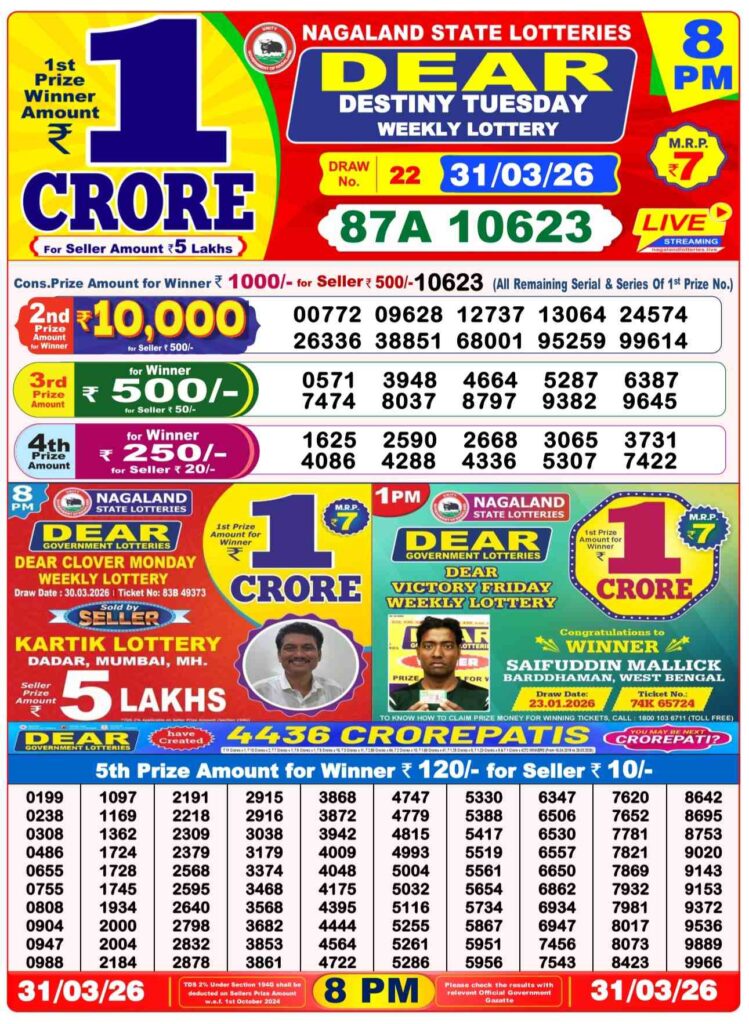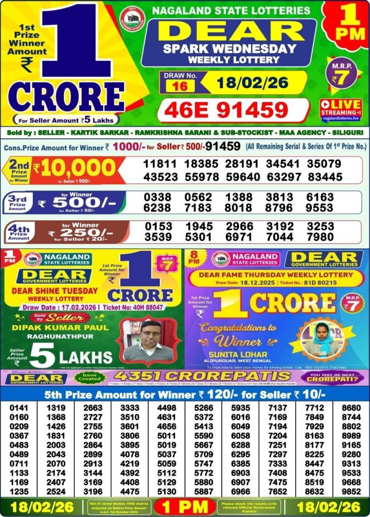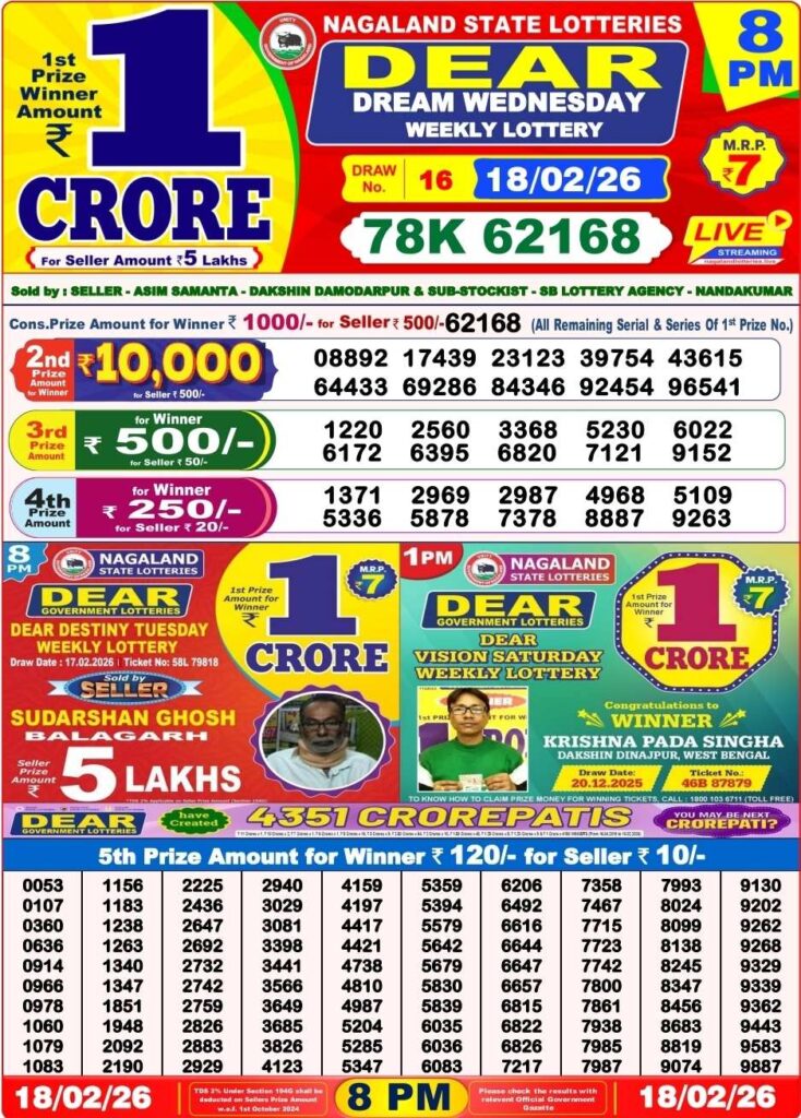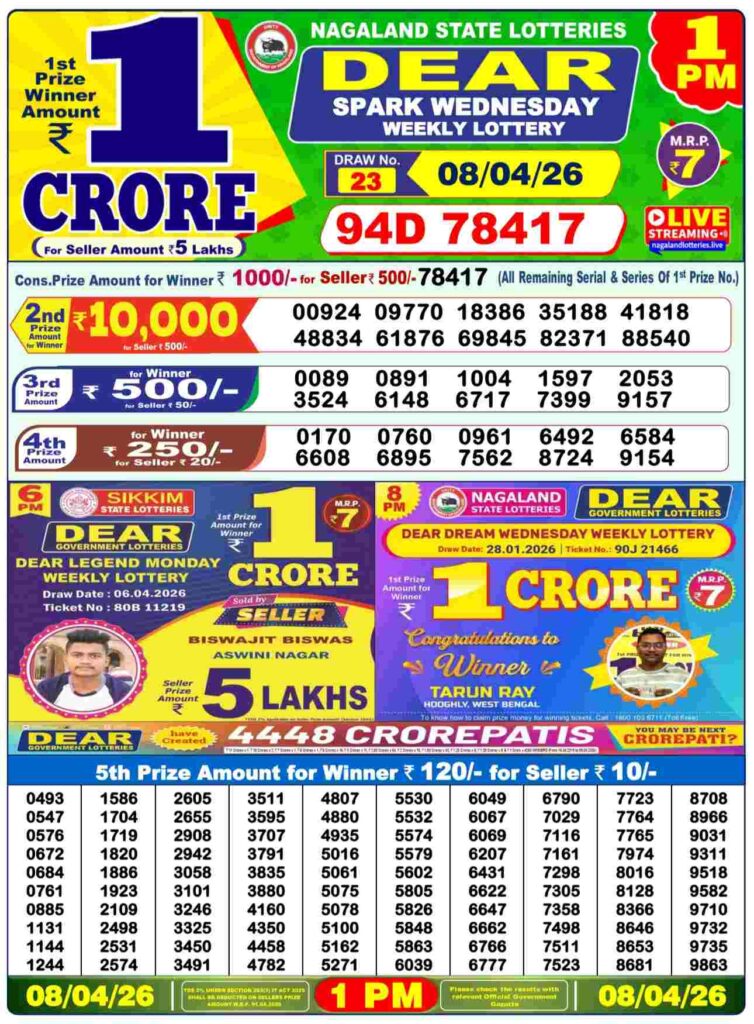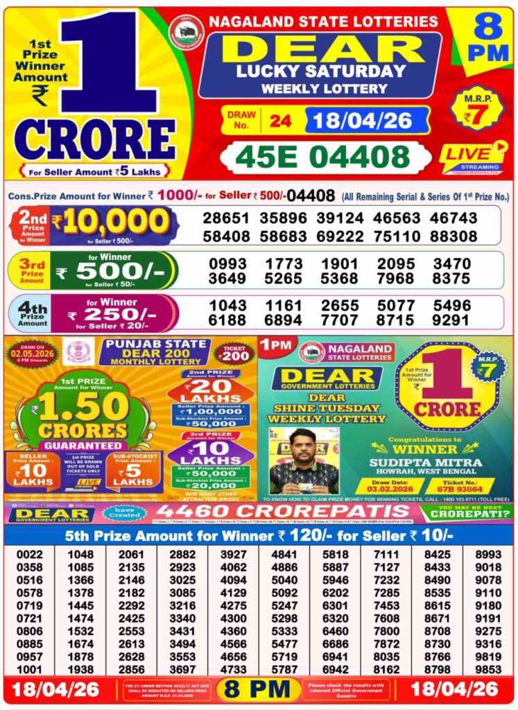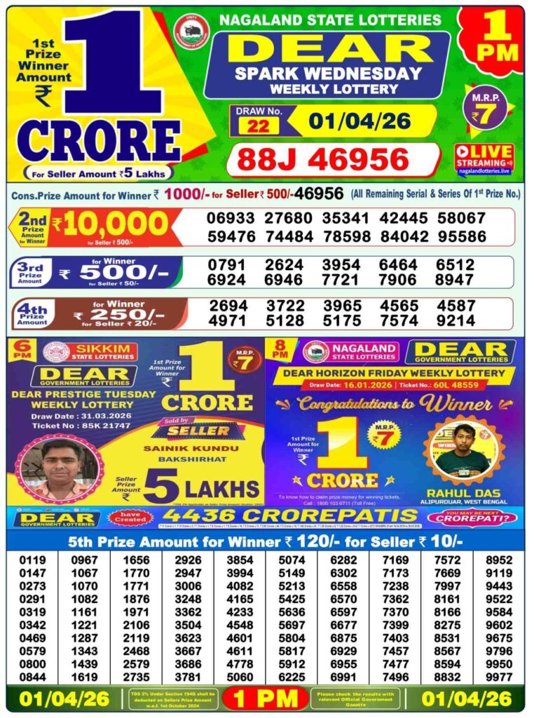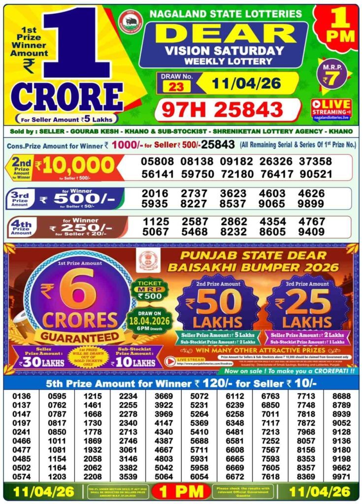 আজকের প্রথম খেলা ১১টা ৫৫ এর সময় নাগাল্যান্ড রাজ্য লটারি থেকে ‘DEAR TEESTA MORNING’, আজকের দিনের লটারি সংবাদের দ্বিতীয় খেলা নাগাল্যান্ড এর ই কোহিমা শহর থেকে বিকাল ৪টার সময় ‘DEAR MOON TUESDAY’, আজকের শেষ খেলা রাত ৮টার সময় নাগাল্যান্ডের ‘DEAR PARROT EVENING’, প্রত্যেক টি খেলার পুরস্কার ই ১ কোটি টাকা।