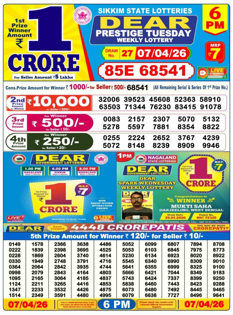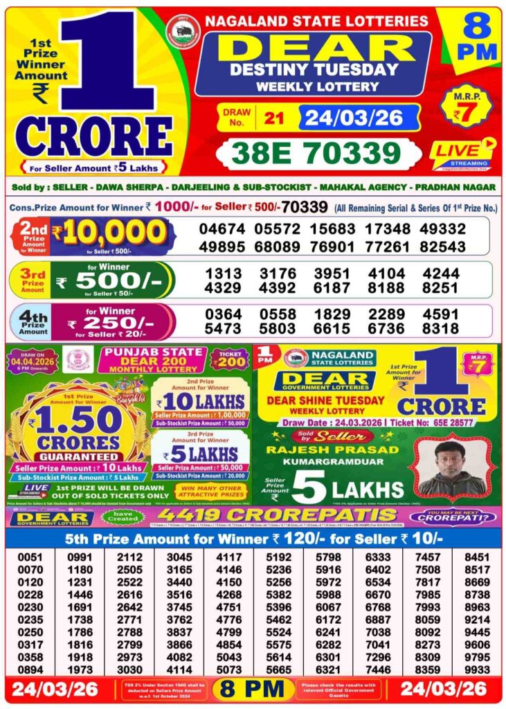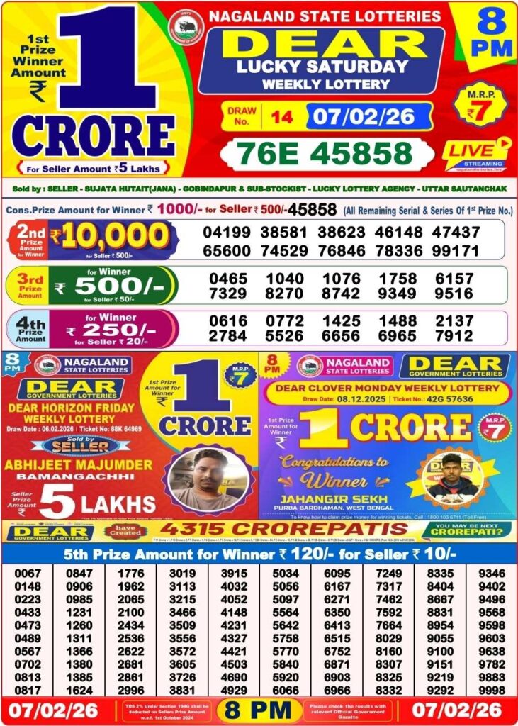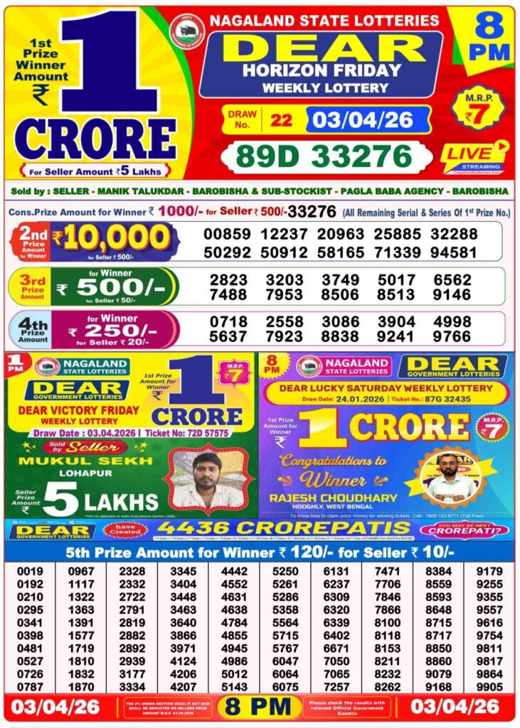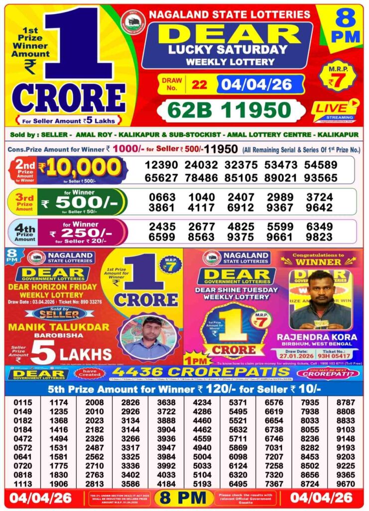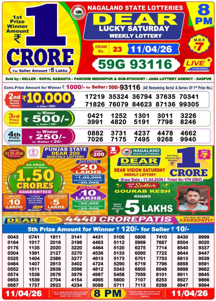 আজকের প্রথম খেলা ১১টা ৫৫ এর সময় নাগাল্যান্ড রাজ্য লটারি থেকে ‘DEAR TEESTA MORNING’, আজকের দিনের লটারি সংবাদের দ্বিতীয় খেলা নাগাল্যান্ড এর ই কোহিমা শহর থেকে বিকাল ৪টার সময় ‘DEAR MOON TUESDAY’, আজকের শেষ খেলা রাত ৮টার সময় নাগাল্যান্ডের ‘DEAR PARROT EVENING’, প্রত্যেক টি খেলার পুরস্কার ই ১ কোটি টাকা।