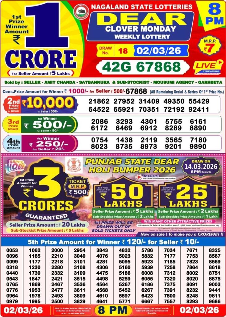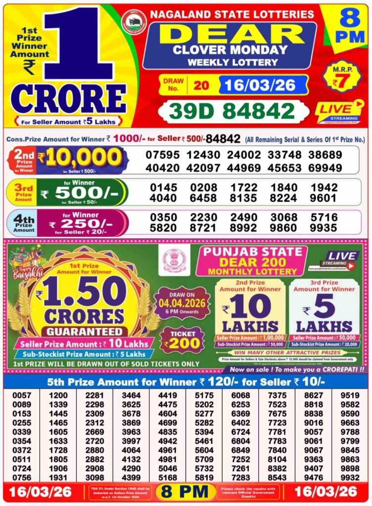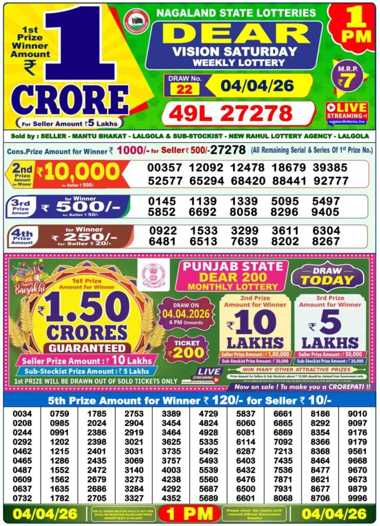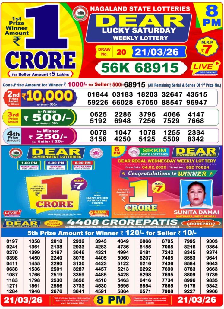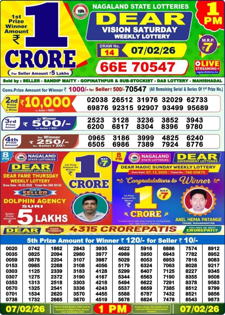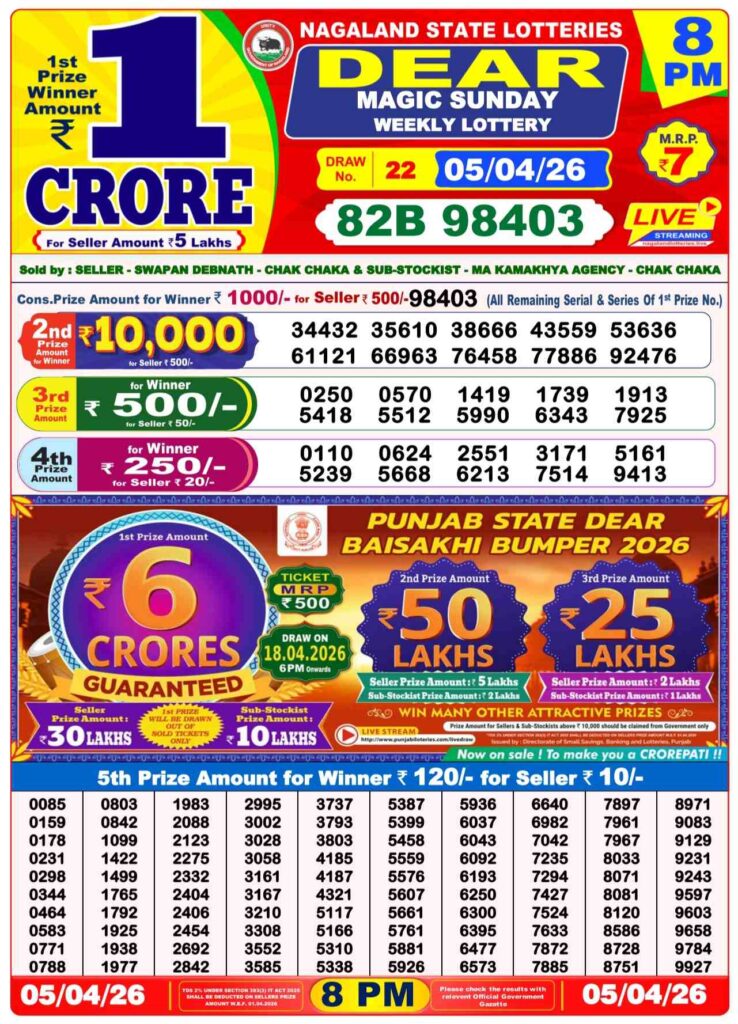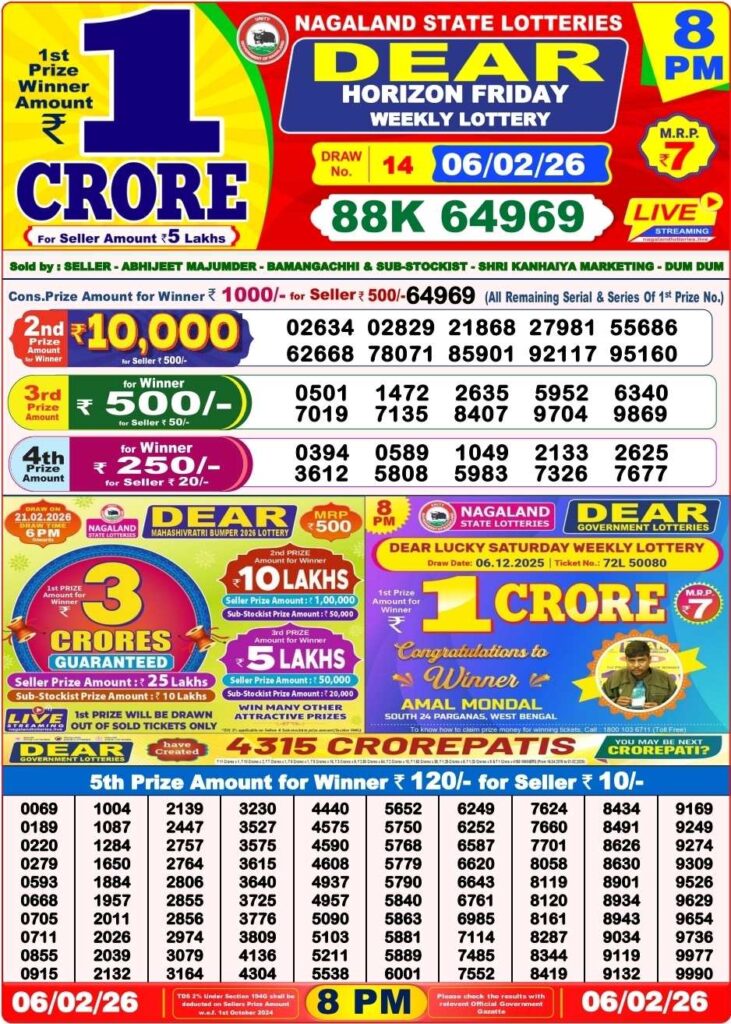 আজকের প্রথম খেলা ১১টা ৫৫ এর সময় নাগাল্যান্ড রাজ্য লটারি থেকে ‘DEAR TEESTA MORNING’, আজকের দিনের লটারি সংবাদের দ্বিতীয় খেলা নাগাল্যান্ড এর ই কোহিমা শহর থেকে বিকাল ৪টার সময় ‘DEAR MOON TUESDAY’, আজকের শেষ খেলা রাত ৮টার সময় নাগাল্যান্ডের ‘DEAR PARROT EVENING’, প্রত্যেক টি খেলার পুরস্কার ই ১ কোটি টাকা।