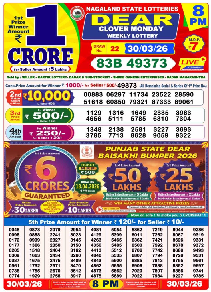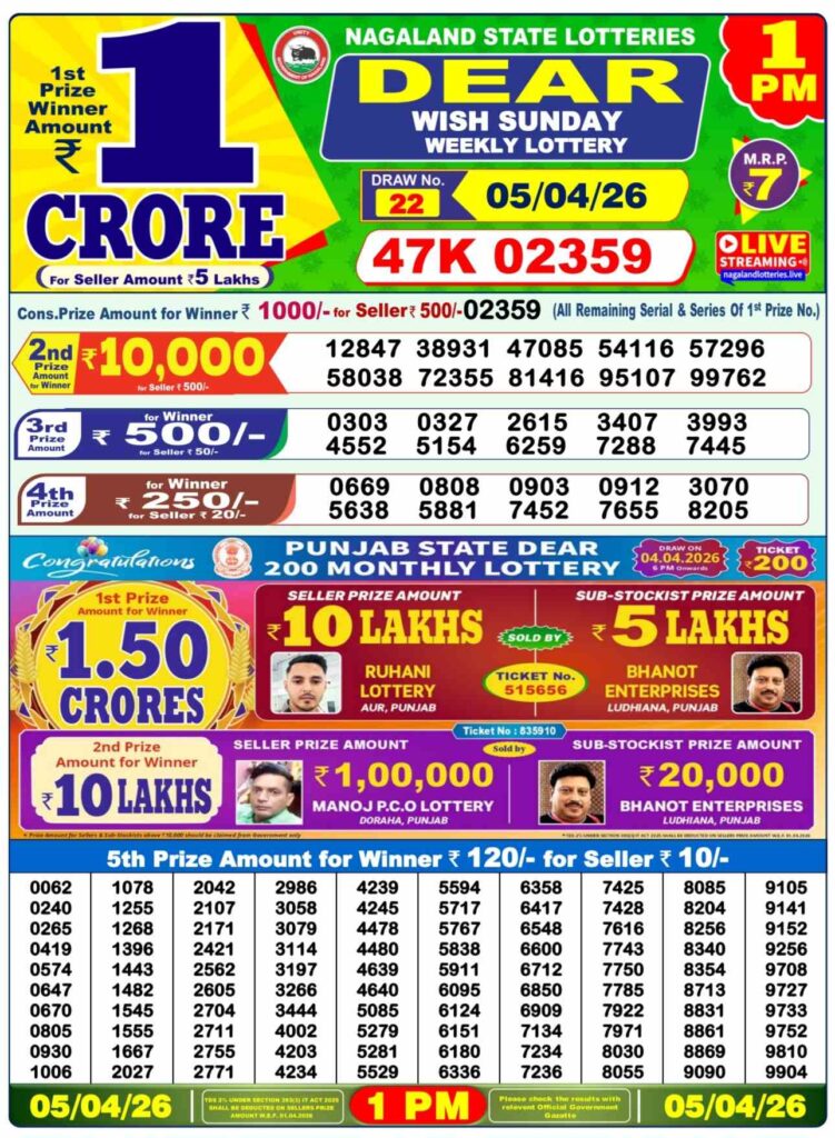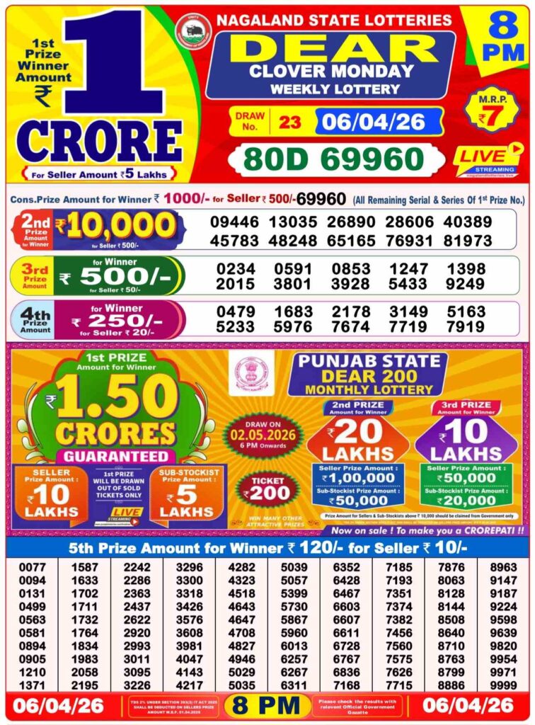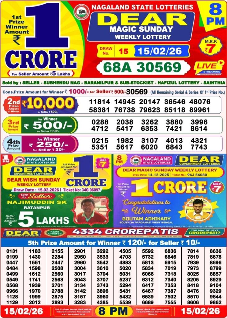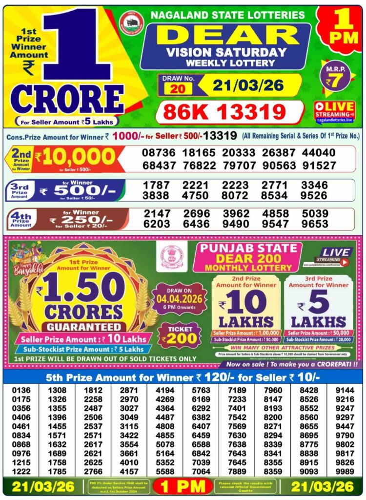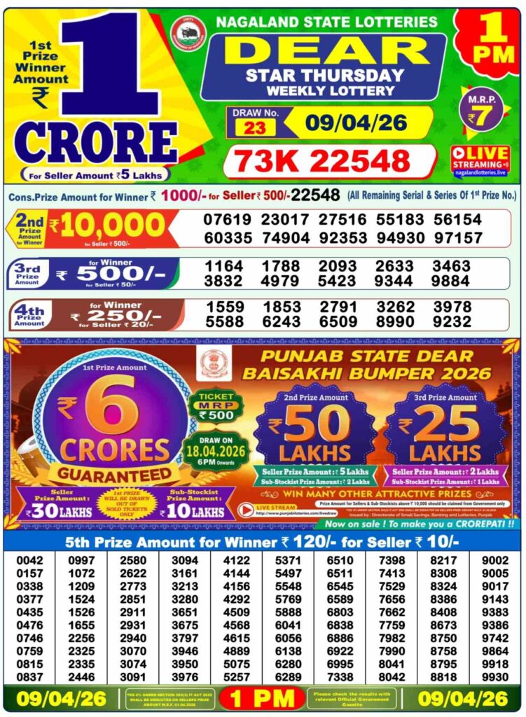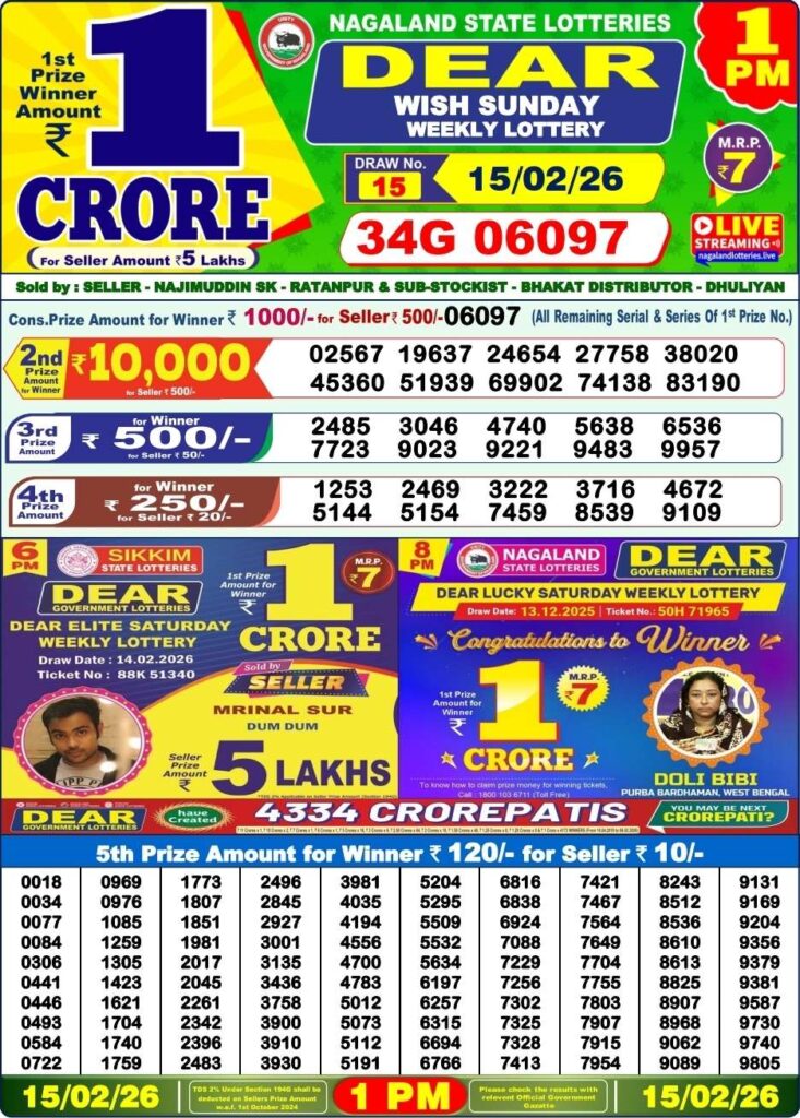 আজকের প্রথম খেলা ১১টা ৫৫ এর সময় নাগাল্যান্ড রাজ্য লটারি থেকে ‘DEAR TEESTA MORNING’, আজকের দিনের লটারি সংবাদের দ্বিতীয় খেলা নাগাল্যান্ড এর ই কোহিমা শহর থেকে বিকাল ৪টার সময় ‘DEAR MOON TUESDAY’, আজকের শেষ খেলা রাত ৮টার সময় নাগাল্যান্ডের ‘DEAR PARROT EVENING’, প্রত্যেক টি খেলার পুরস্কার ই ১ কোটি টাকা।