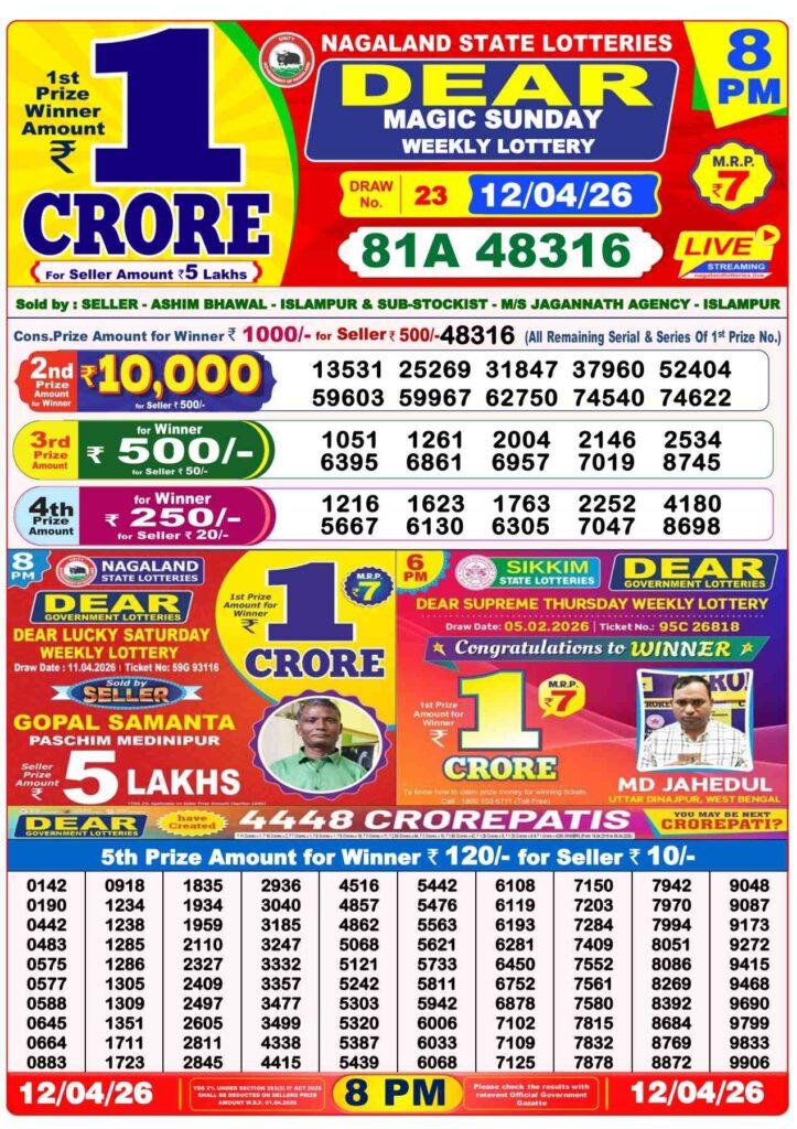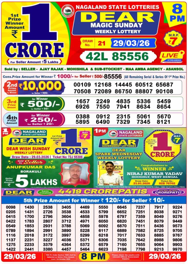 Daily Nagaland State lottery result published 3 times 11:55am morning, 4pm day and 8pm night and this live results are also posted here in this website and here we show you the image version also Lottery Sambad