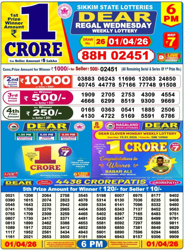লটারি সংবাদ পশ্চিমবঙ্গে খেলা হয় ২টি রাজ্যের, একটি হলো সিকিম এবং আরেকটি হলো নাগাল্যান্ড। এই দুই রাজ লটারিই পশ্চিমবঙ্গে ভীষণভাবে জনপ্রিয়, যদিও এই জনপ্রিয়তা দেখেই পশ্চিমবঙ্গ রাজ্য লটারিও তাদের নিজস্ব বঙ্গলক্ষী লটারি বাজারে আনে কিন্তু সেটা ভালো ফল না করায় বন্ধও হয়ে যায় কিছুদিনের মধ্যে। ডিয়ার লটারির কাছে হার মেনে যায় বঙ্গলক্ষী লটারি। আজ লটারি সংবাদের ডিয়ার লটারি রেজাল্ট ৩ বার বের হবে। প্রথম ১১তা ৫৫ তে, দ্বিতীয় ৪টা তে, এবং তৃতীয় ৮টা তে।
