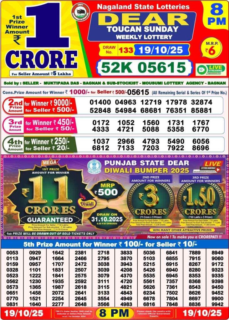 আজকের প্রথম খেলা ১১টা ৫৫ এর সময় নাগাল্যান্ড রাজ্য লটারি থেকে ‘DEAR TEESTA MORNING’, আজকের দিনের লটারি সংবাদের দ্বিতীয় খেলা নাগাল্যান্ড এর ই কোহিমা শহর থেকে বিকাল ৪টার সময় ‘DEAR MOON TUESDAY’, আজকের শেষ খেলা রাত ৮টার সময় নাগাল্যান্ডের ‘DEAR PARROT EVENING’, প্রত্যেক টি খেলার পুরস্কার ই ১ কোটি টাকা।