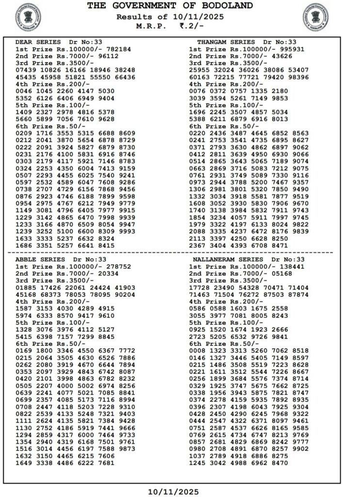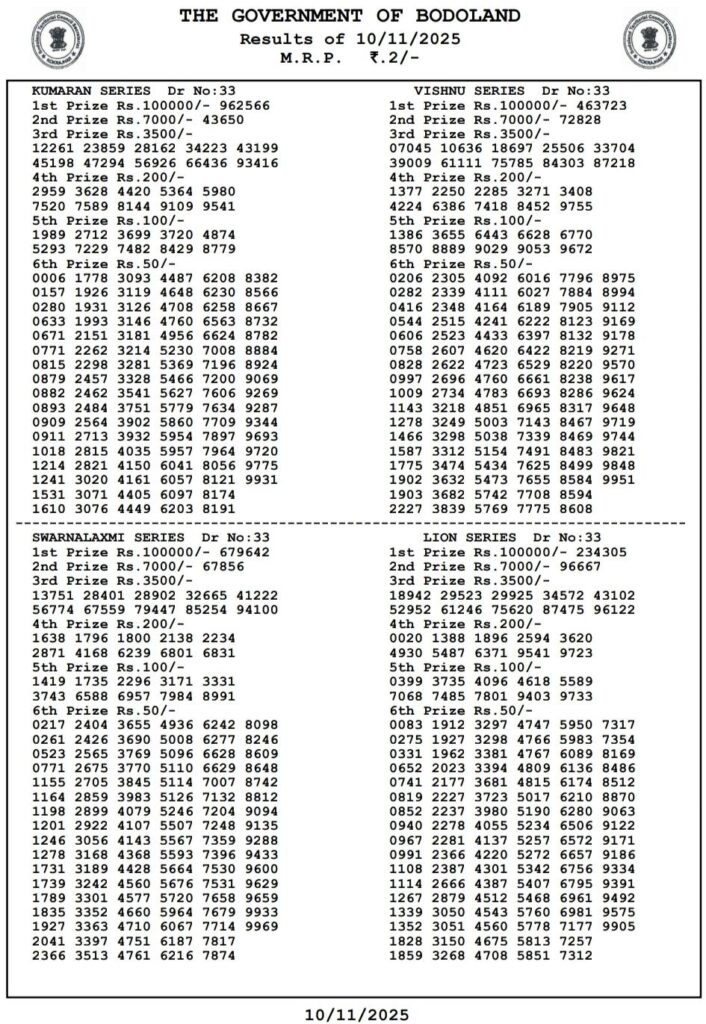 Bodoland Lotteries Result Today 11.11.2025 Today 3PM Result