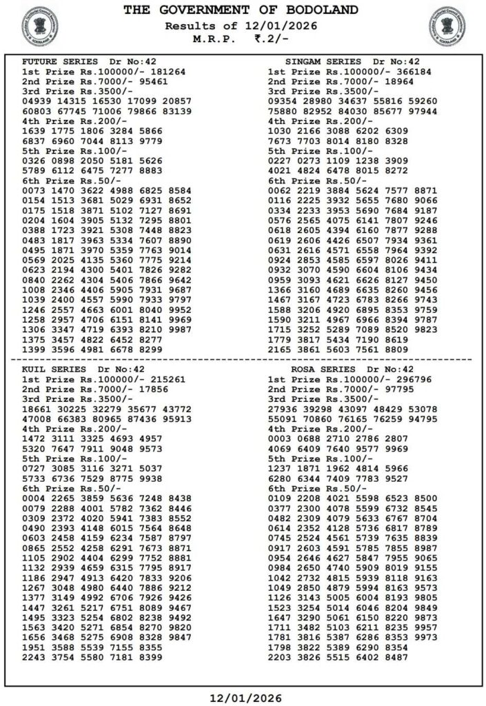 Bodoland Lotteries Result Today 13.1.2026 3PM Result Live: Good day my dear friends there you are landed at the site which has been named to be as lottery sambad dear and dear friends you know that all the posts been updated with the lottery sambad results and there you can win the most popular prize of 1 crore rupees and friends you knwo that this special post can be udpated with the most lovely Bodoland lottery result 3pm day reuslt and its the another day of Sunday a holiday 7th of Deccember 2025 its days peoples most favourite sambad lottery which will be alwyas been known to be as Bodoland lotteries this is the most awesome 1st lottery you can say as is Bengali language লটারী সংবাদ and result will post at the best timing 3:10pm here you also get the lottery sambad live draw and the lottery sambad old result and try it daily.