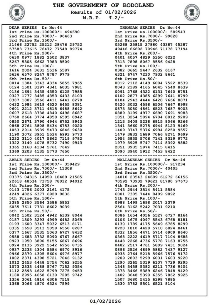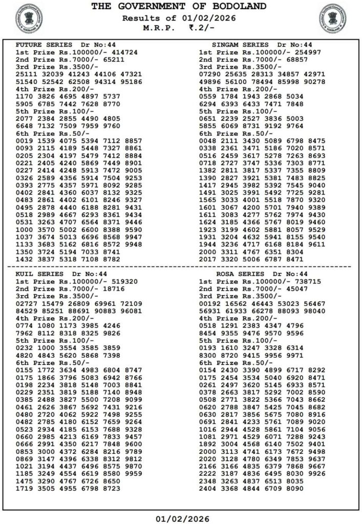 Bodoland Lotteries Result Today 2.2.2026 Today 3PM Result