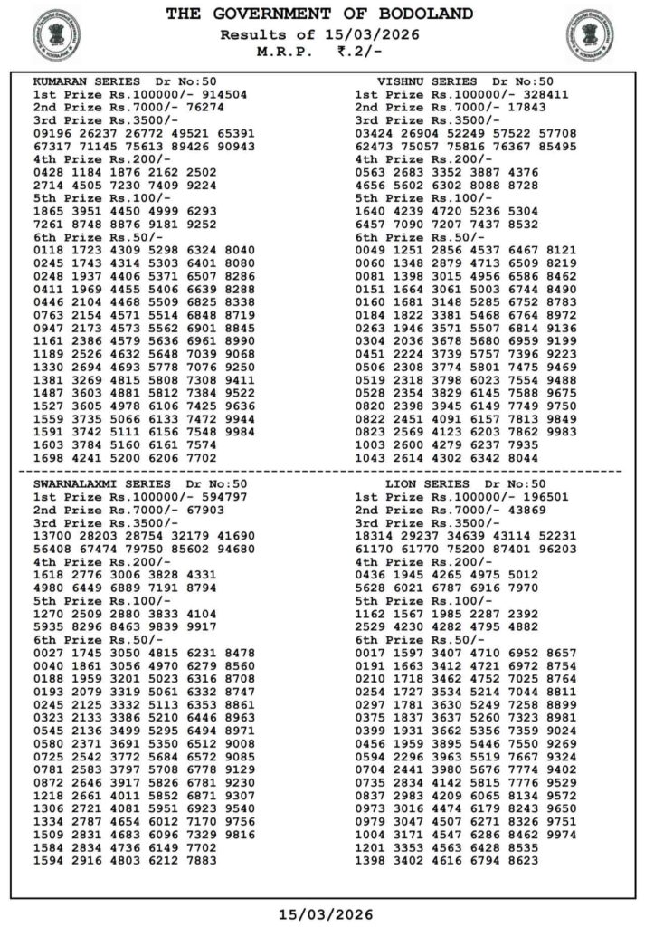 Bodoland Lotteries Result Today 15.3.2026 Today 3PM Result