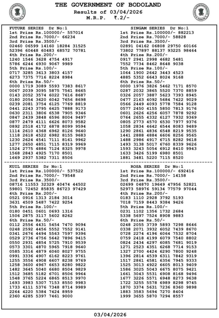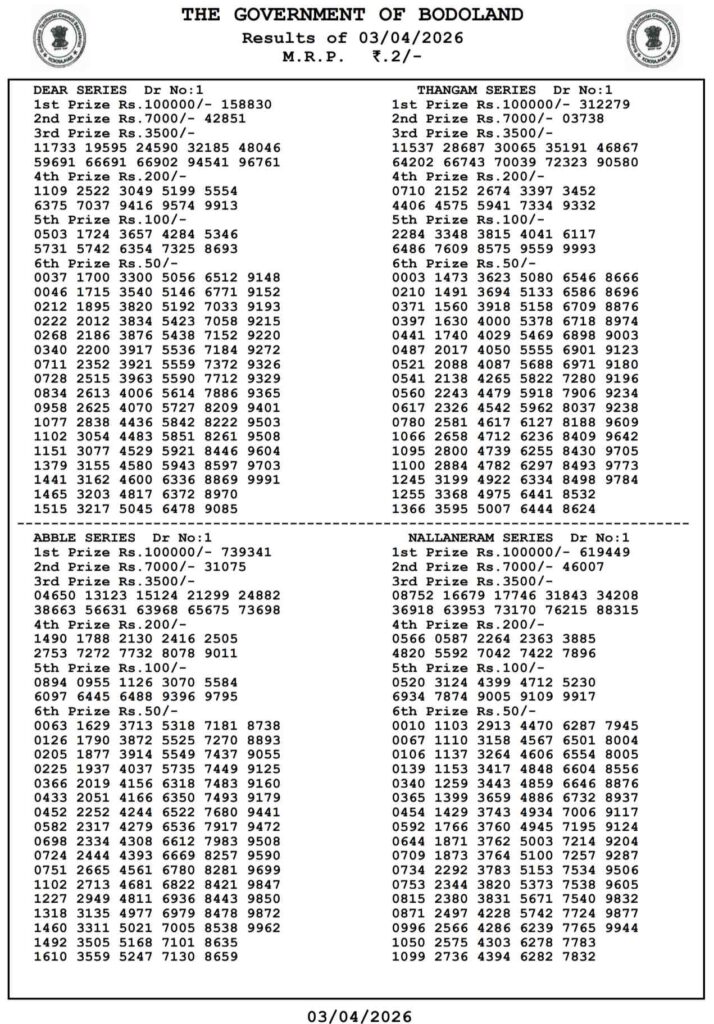 Bodoland Lotteries Result Today 4.4.2026 Today 3PM Result