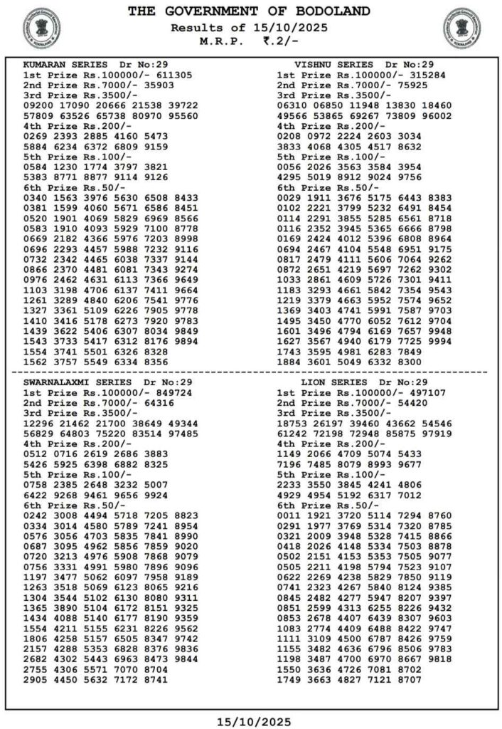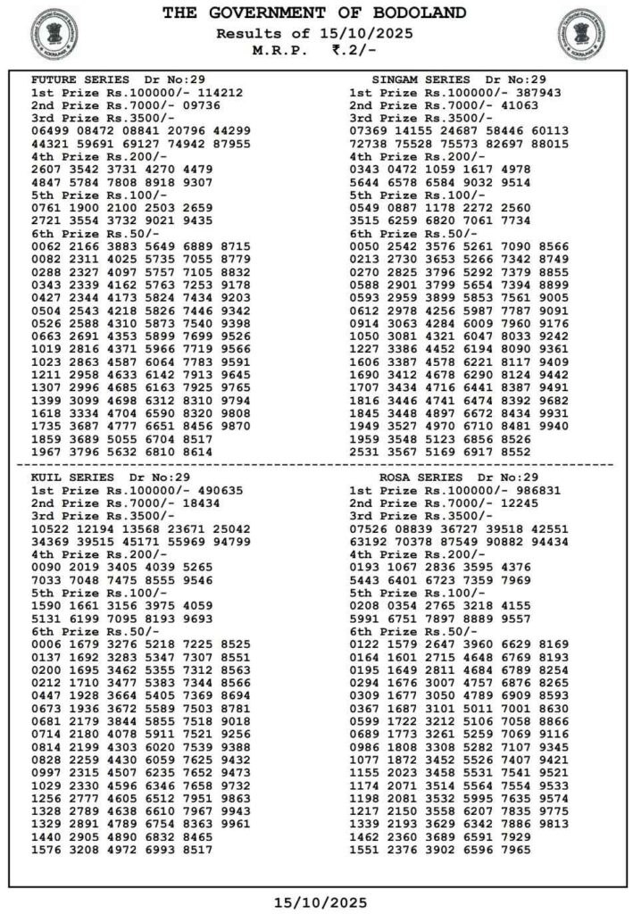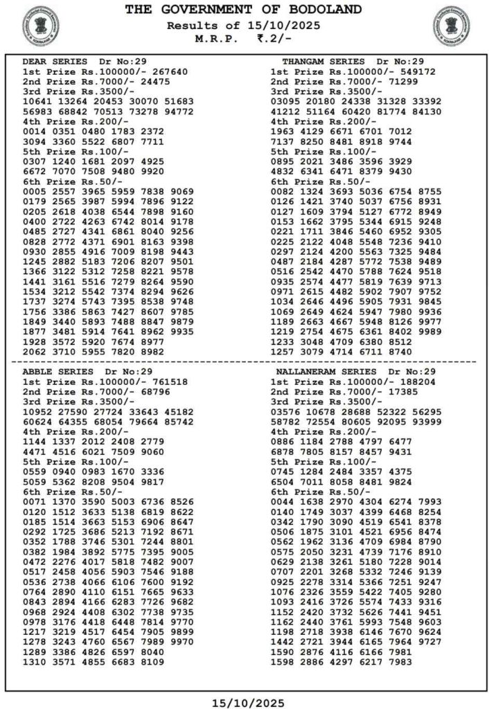 Bodoland Lotteries Result Today 16.10.2025 Today 3PM Result
