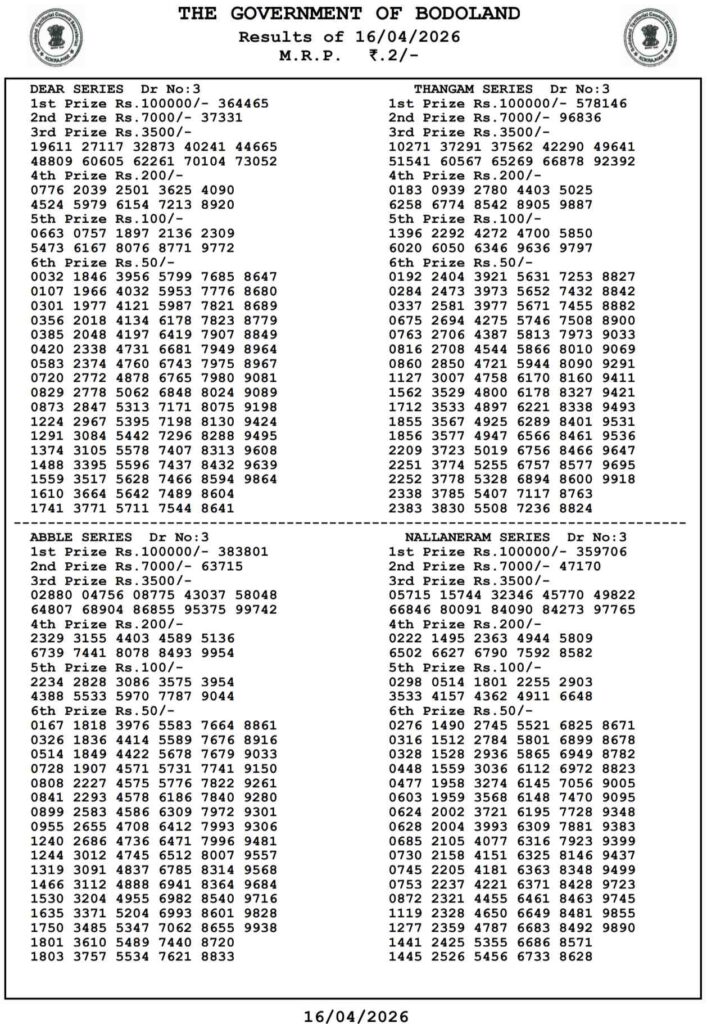 Bodoland Lotteries Result Today 17.4.2026 Today 3PM Result